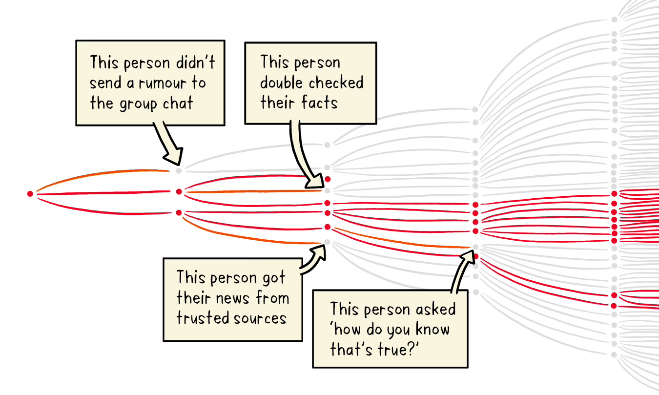 You probably remember from the COVID-19 pandemic that breaking a few links in the chain can have a dramatic impact on the number of infections. So it is with misinformation. Persuading just a few people to think twice before sharing information can have a dramatic impact on the spread.