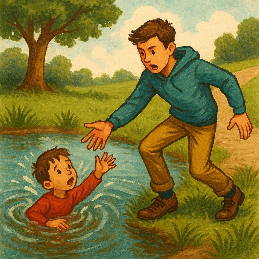 “One morning, you notice that a child has fallen into the pond and appears to be drowning. You could easily wade in and save them, but if you do then your clothes will get muddy. Your shoes will almost certainly be ruined.